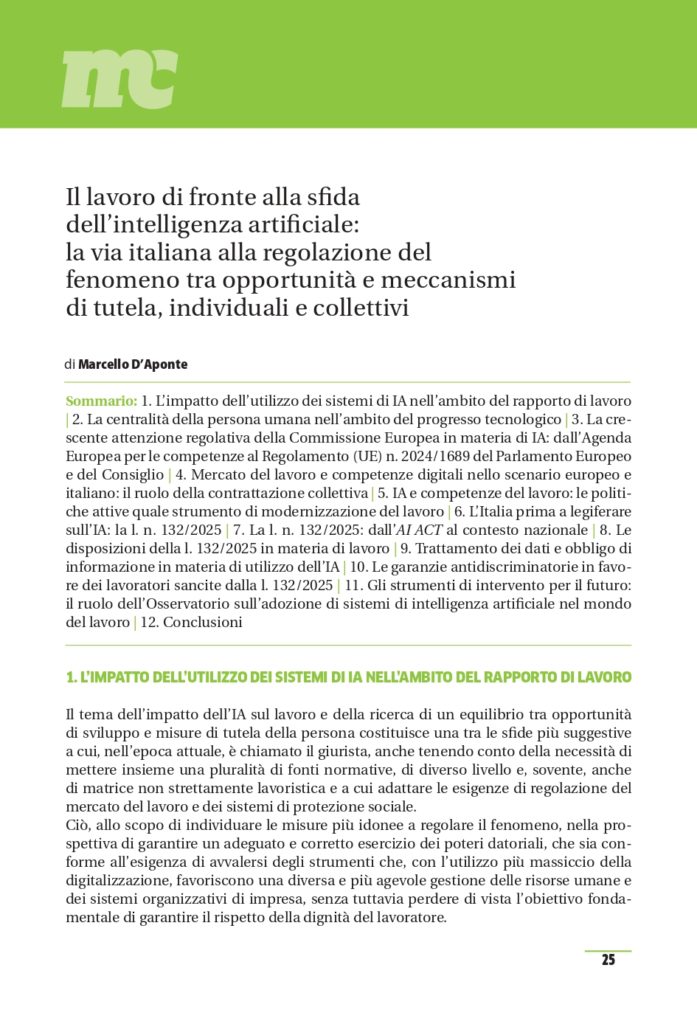 Con il presente saggio, l’A. affronta il delicato tema dell’impatto dell’utilizzo dei sistemi di IA nell’ambito del rapporto di lavoro, con particolare attenzione all’attività regolativa della Commissione Europea, dall’Agenda Europea per le competenze al Regolamento (UE) n. 2024/1689 del Parlamento Europeo e del Consiglio, fino alla l. 132 del 2025, con cui l’Italia ha dato attuazione alle disposizioni europee.