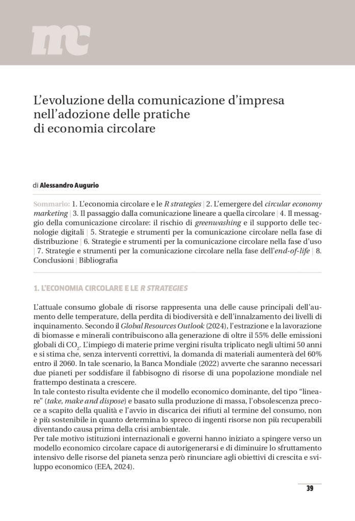 La transizione dai modelli economici lineari, fondati sull’estrazione intensiva di risorse e sulla produzione di rifiuti, verso modelli circolari di natura rigenerativa attribuisce alla comunicazione d’impresa un ruolo strategico nel promuovere cambiamenti nei comportamenti, nei valori e nelle percezioni dei consumatori.