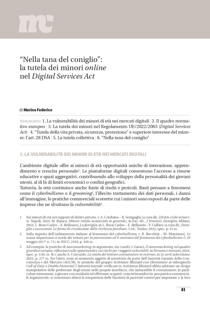Il presente contributo si sofferma sulla disciplina dell’art. 28 del Regolamento europeo 2022/2065 (Digital Services Act, DSA), sulla tutela dei minori online. L’articolo propone un’interpretazione estensiva delle nozioni di “privacy, sicurezza e protezione” dei minori, alla luce del best interest of the child, e una lettura degli interessi tutelati in chiave anche collettiva.